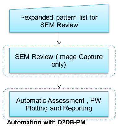 A critical defect - Cross TEM analysis of failed sample. In addition to the need to improve defect detection there was a requirement for expanding the sample size for the measurement of critical dimensions for determining a more accurate process window. So it was decided to apply the D2DB-PM solution to perform root cause study from the lithography step to the final metal fill and CMP process steps using a process window qualification (PWQ) wafer. The potential to run fully automated analysis of SEM Review images offered an opportunity to collect a huge volume of images from the wafer– which is otherwise impractical to do on a CDSEM platform. With a combination of inputs from OPC verification results and the PWQ optical wafer inspection, a set of about 200 die locations were shortlisted for SEM review across and beyond the process window die. The data flow outlined in Figure 3 was employed by the team for automatically processing the thousands of SEM images that were collected after every process step. The automated D2DB-PM solution measured the feature size of all patterns-of-interest falling within the field of view of every SEM image. A CD error threshold was then specified by the user to define the process window – such that die in which the errors of all measured patterns fell in the range of the threshold were used to define the process window.