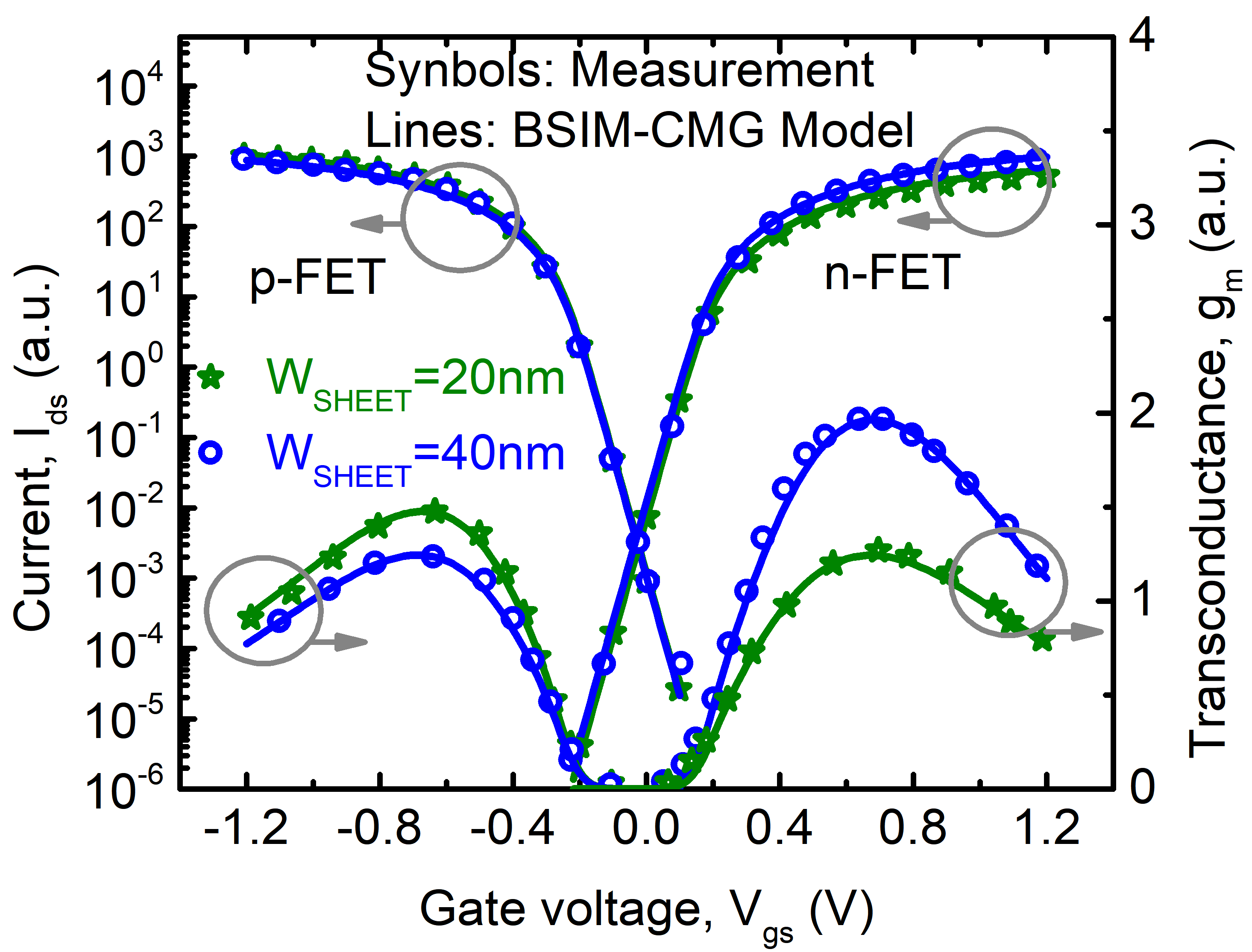 BSIM-CMG, through a geometry module (GEOMOD=5), can calculate accurate values of Ach , Cins and Weff ; which are then used in the core model to get the electrostatic behavior, as described in Section 2. The calculation of Ach and Weff include the effects of rounded corners (Figure 1). This model also has the ability to accurately simulate multiple GAA bodies in a single fin (stack). The user can specify various geometry details like the width and thickness of the GAA bodies, the separation between GAA bodies, the number of GAA bodies per fin, fin height etc. The model takes all this geometry information to calculate the electrostatics accordingly. The model can also account for geometry variation among the GAA bodies inside a single fin. In addition to accounting the aforementioned geometry variations, the model further supports Monte Carlo circuit simulation to account for the stochastic device geometric variations that may be encountered in manufacturing.